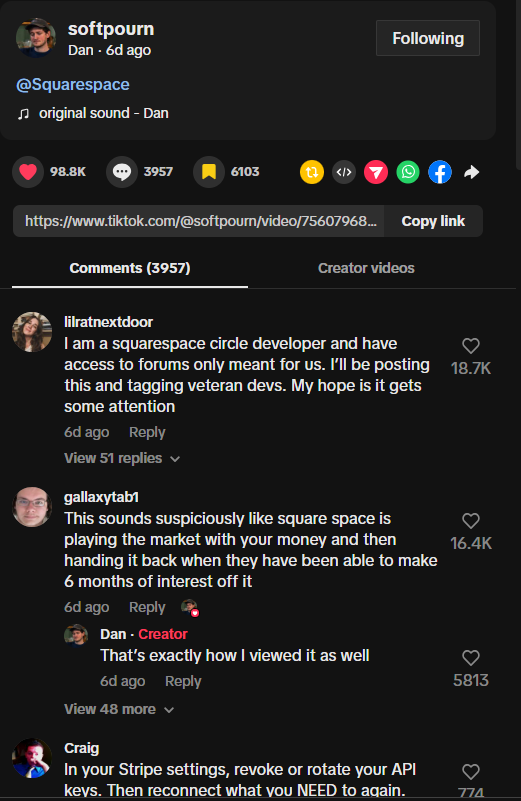 Confirmation bias is loading across multiple audiences. Small business owners who distrust big platforms will see this as proof. Squarespace skeptics will share it as validation. People evaluating website platforms will bookmark it as a warning signal. One commenter, a Squarespace web designer, wrote: "I'm very concerned about this for my future clients who have product-based businesses so I will be contacting them about this. Let's put the pressure on them for the sake of other business owners."